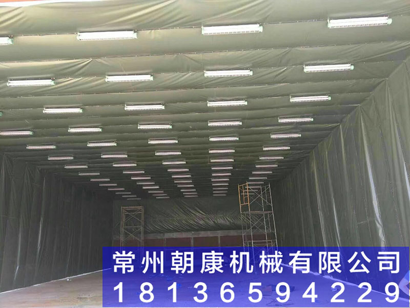 噴漆時送風機、排風機同時啟動(若冬季需要提高操作環境的溫度,加熱系統也同時啟動),室外新鮮空氣由進風口經過進風過濾器進入加熱送風機組,再由送風機將處理后的氣流送入到噴漆間頂部的靜壓室,靜壓室底部的過濾棉對氣流進行均壓過濾后呈層流方式進入到噴漆間內,在工件和操作工人周圍形成由上而下的微風氣流,使噴漆時產生的剩余漆霧隨氣流而下,不會向四周彌散,以保護操作者勞動安全。室內空載平均風速為0.3~0.5米/秒。在有序氣流的作用下,含漆霧空氣穿過輕型格柵進入排風地溝,大部分漆霧在繞過地溝格柵下面的折流板時因氣流突然折射的原因漆霧顆粒隨慣性作用而沉降在折流板上,剩余的細小漆霧顆粒隨氣流再次經過折流板下面的漆霧過濾棉對剩余漆霧顆粒進行過濾,凈化后的氣流通過防爆排風機排向室外高空。漆霧凈化效率≥95%當需要對工件進行烘干時,加熱送風系統可設計成為循環加熱送風,不斷的對噴漆間內的空氣及工件表面進行循環加熱,保證噴漆間內工件表面漆膜的烘干需要。 干式噴漆房+伸縮移動式噴漆房